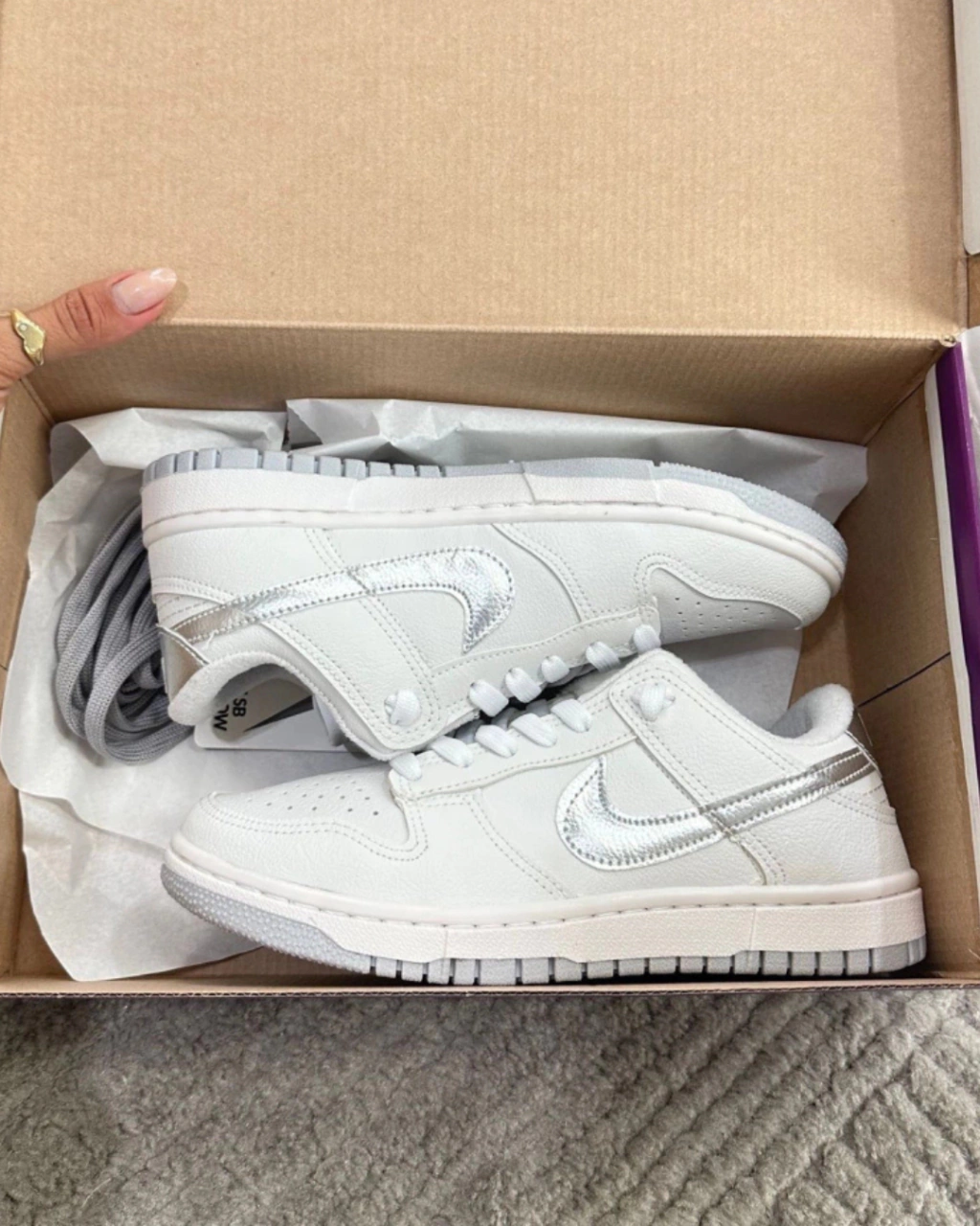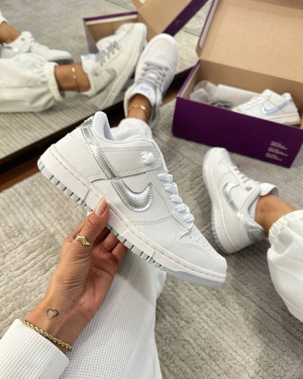 O Dunk Branco/Prata é a escolha ideal para quem busca um tênis versátil, autêntico e elegante para o dia a dia.